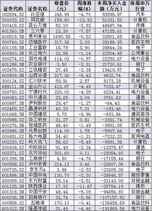 資金方面,本周北向資金累計凈賣出金額達178.88億元,其中滬股通凈賣出58.88億元,深股通凈賣出120億元。從前十大成交活躍股來看,本周,比亞迪、同花順等2只個股,北向資金凈買入金額均超5億元。另外,隆基綠能、五糧液、招商銀行等個股遭北向資金凈賣出金額均超10億元。