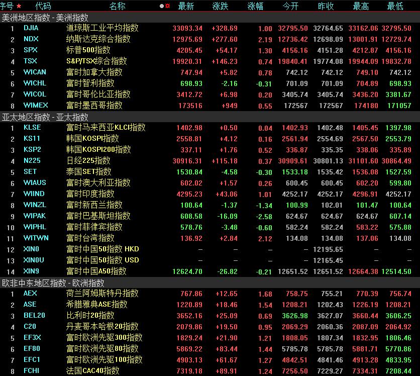 周五,美國三大股指全線收漲,道指漲1%報33093.34點,標普500指數(shù)漲1.3%報4205.45點,納指漲2.19%報12975.69點。本周,道指跌1%,標普500指數(shù)漲0.32%,納指漲2.51%。