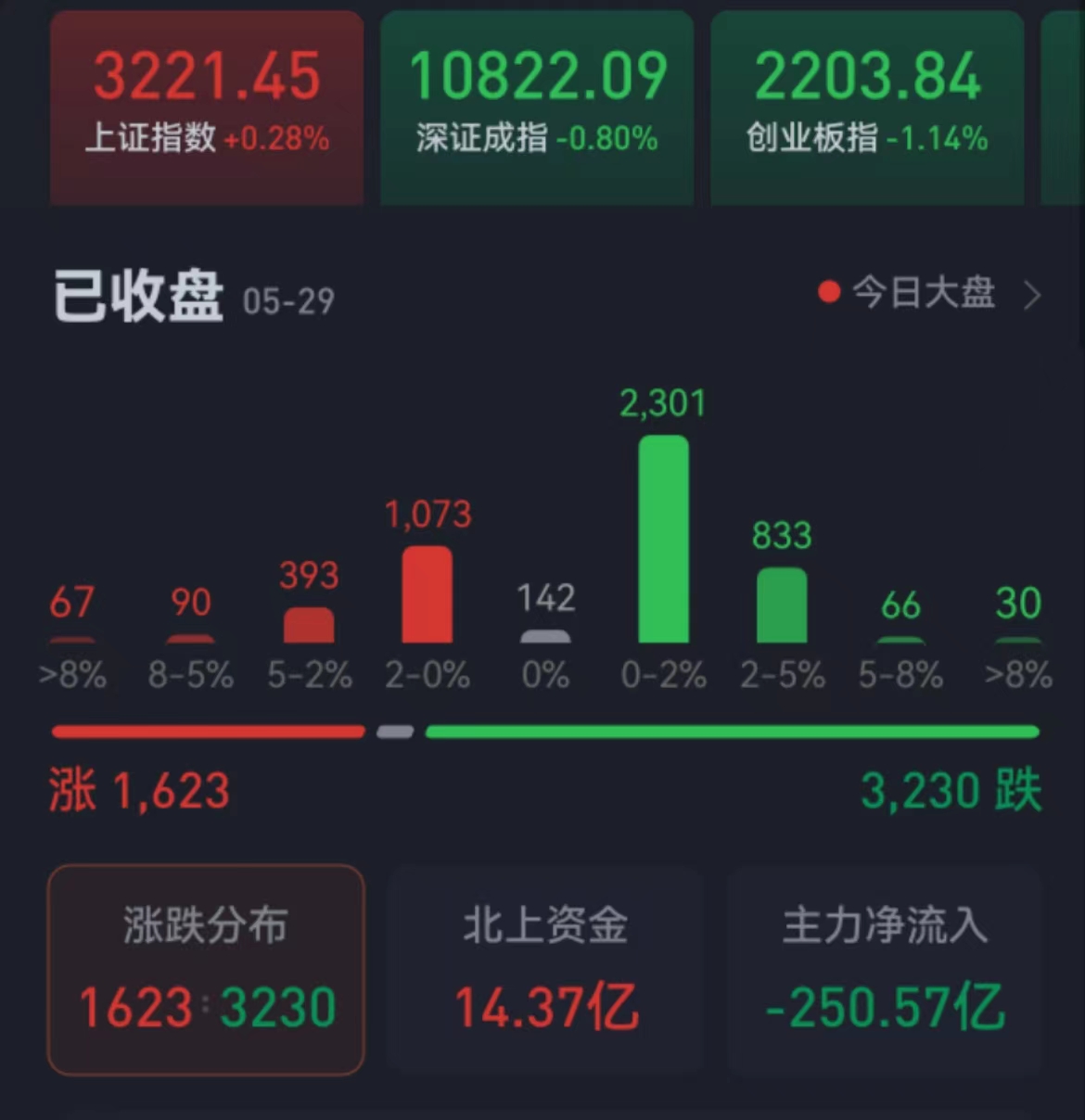 周一(5月29日),A股三大股指震蕩分化,漲跌不一。截至收盤,上證指數(shù)漲0.28%報3221.45點,深證成指跌0.80%報10822.09點,創(chuàng)業(yè)板指跌1.14%報2203.84點;兩市合計成交9208億元,北向資金凈買入額達14.37億元??傮w上看,兩市個股漲少跌多。其中,漲停個股達41只,跌停個股達43只。