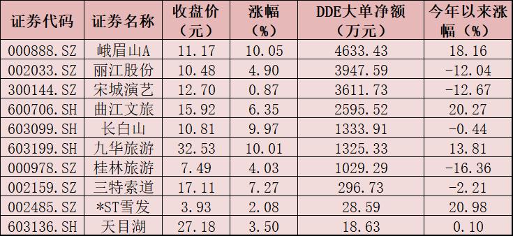 表:5月31日獲大單資金凈買入的景點及旅游股一覽