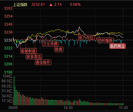 6月5日早盤(pán),A股三大指數(shù)震蕩分化,滬市表現(xiàn)相對(duì)強(qiáng)勢(shì),長(zhǎng)時(shí)間處于紅盤(pán)。截至上午11:30,上證指數(shù)漲0.08%,報(bào)3232.81點(diǎn),深證成指和創(chuàng)業(yè)板指跌幅分別為0.62%和1.47%;滬深兩市成交額合計(jì)5702億元??傮w來(lái)看,A股市場(chǎng)個(gè)股漲跌數(shù)接近,有2449只上漲,2469只下跌,漲跌停方面,有50只個(gè)股漲停,跌停股10只。