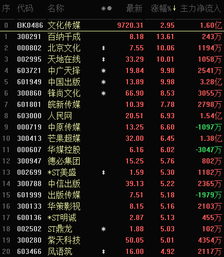 從早盤(pán)表現(xiàn)強(qiáng)勢(shì)的文化傳媒行業(yè)看,交易中的107只成份股中有98只上漲,其中,有19只個(gè)股漲幅超5%。資金方面,有1.60億元大單資金凈流入該行業(yè),居各行業(yè)第5位。