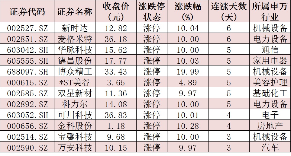 表:連續(xù)上漲3日且今日收盤漲停個(gè)股情況: