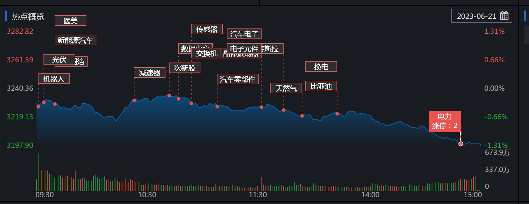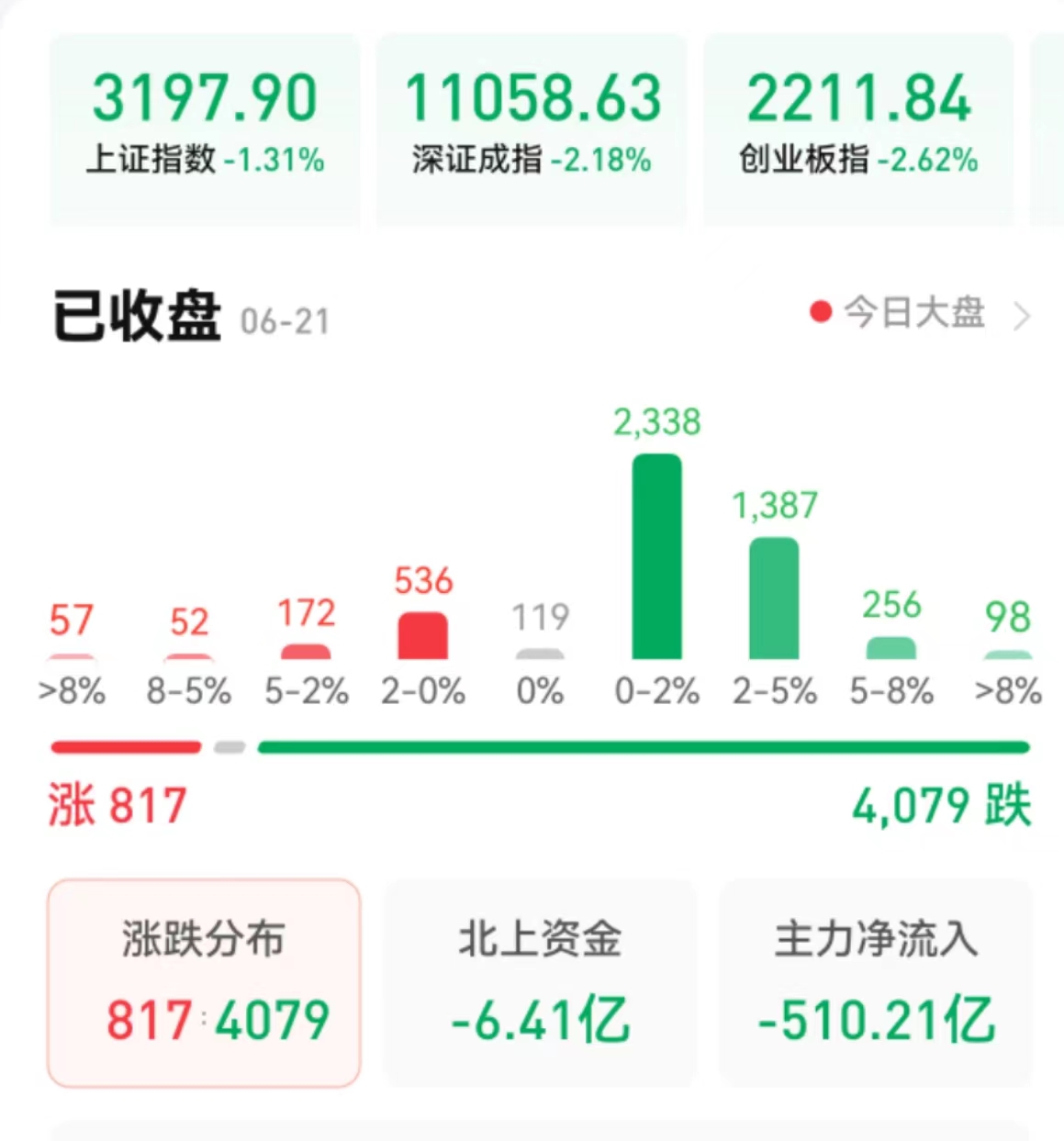 周三(6月21日),A股三大股指震蕩回落,全線飄綠。截至收盤,上證指數(shù)跌1.31%,報(bào)3197.9點(diǎn);深證成指跌2.18%,報(bào)11058.63點(diǎn);創(chuàng)業(yè)板指跌2.62%,報(bào)2211.84點(diǎn)。兩市合計(jì)成交金額10219億元,連續(xù)第6個(gè)交易日突破萬(wàn)億元。北向資金凈賣出6.41億元。總體上看,兩市個(gè)股跌多漲少,超4000只個(gè)股下跌,其中,漲停個(gè)股達(dá)47只,跌停個(gè)股達(dá)20只。