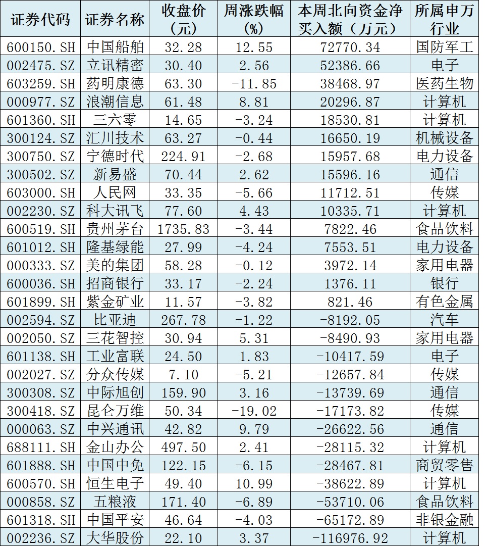 資金方面,本周北向資金累計(jì)凈賣出金額達(dá)3.46億元。從前十大成交活躍股來看,本周,中國船舶、立訊精密等兩只個(gè)股,北向資金凈買入金額均超5億元。另外,大華股份、中國平安、五糧液等個(gè)股遭北向資金凈賣出金額均超5億元。