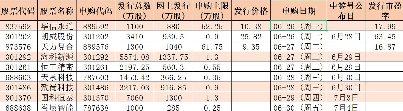 根據(jù)發(fā)行安排,下周(6月26日-30日)有9只新股發(fā)行。從板塊分布來看,下周申購的新股主要集中在創(chuàng)業(yè)板,共有5只新股,其次為北交所和科創(chuàng)板,各有2只新股。