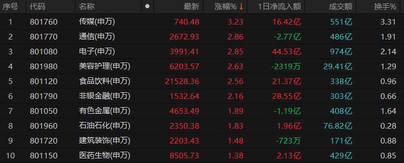 7月13日,行業(yè)漲多跌少。從31個申萬一級行業(yè)看,有30個上漲,占比96.77%,傳媒行業(yè)漲幅居首,達3.23%,大單資金凈流入16.42億元,此外,包括通信和電子等在內(nèi)的5個行業(yè)漲幅均超2%。下跌方面,僅汽車行業(yè)下跌,跌幅為0.78%。
