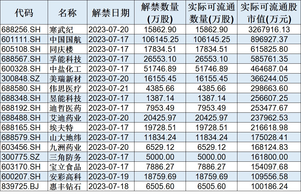 與此同時,據(jù)東方財富統(tǒng)計顯示,下周(7月17日-21日)共有109家公司限售股陸續(xù)解禁,按最新收盤價計算,解禁市值為931.77億元。從解禁市值來看,寒武紀-U(326.79億元)、中國國航(89.69億元)、同慶樓(61.58億元)等公司解禁金額均超60億元。