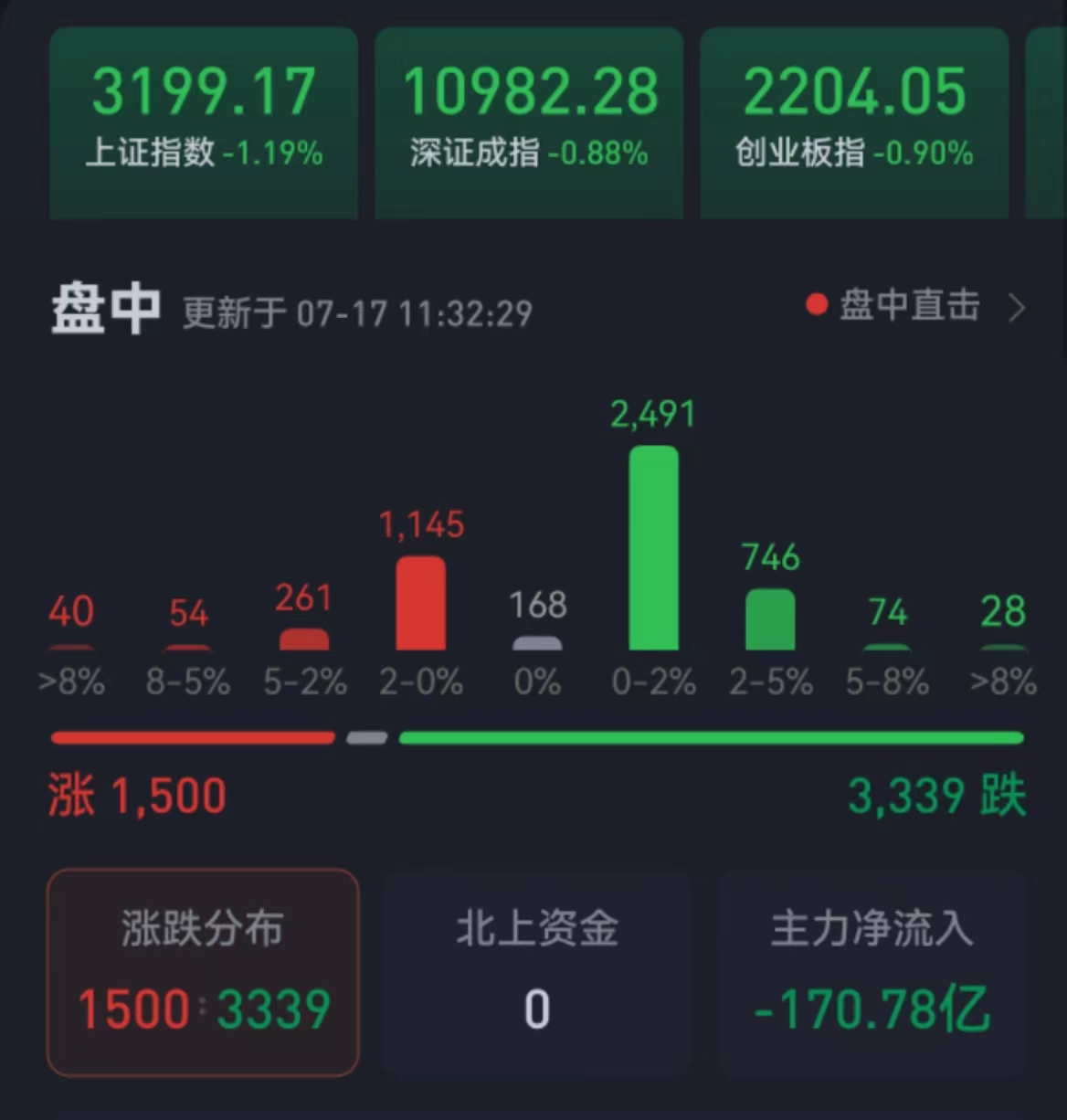 周一(7月17日),三大股指震蕩整理,有所回落。截至上午收盤,上證指數(shù)跌1.19%,報(bào)3199.17點(diǎn),失守3200點(diǎn)整數(shù)關(guān)口;深證成指和創(chuàng)業(yè)板指分別跌0.88%和0.90%;滬深兩市合計(jì)成交額5271.0億元,總體來(lái)看,兩市個(gè)股跌多漲少,超3000只個(gè)股下跌。其中,有24只個(gè)股漲停,9只個(gè)股跌停。