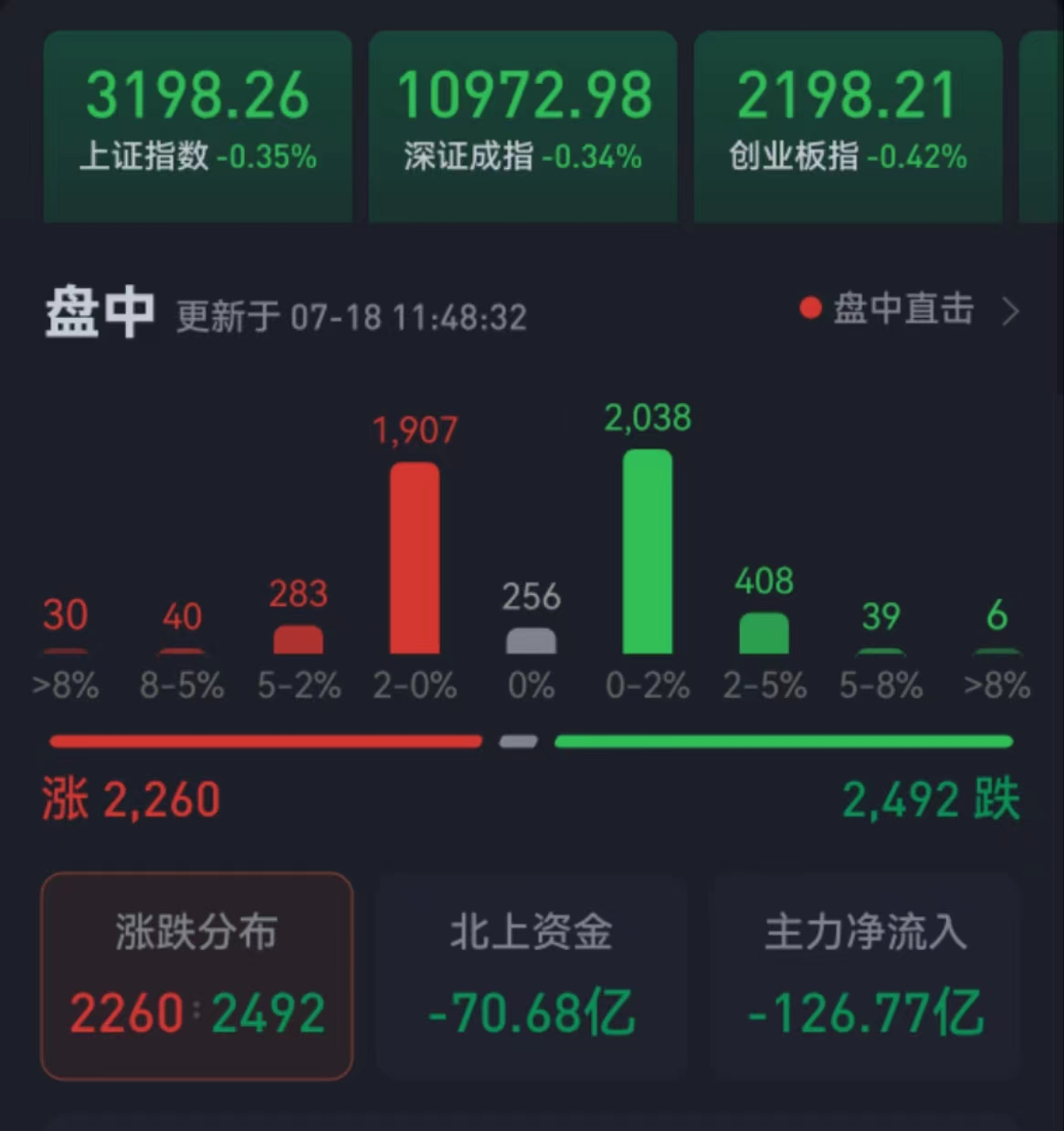 今日三大股指繼續(xù)震蕩整理。截至上午收盤,上證指數(shù)跌0.35%,報3198.26點,失守3200點整數(shù)關(guān)口;深證成指和創(chuàng)業(yè)板指分別跌0.34%和0.42%;滬深兩市合計成交額4807.8億元,總體來看,兩市個股跌多漲少。