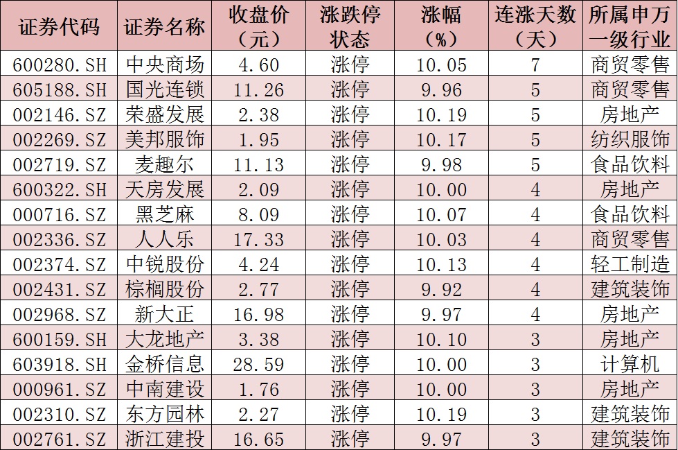表:連續(xù)上漲3日以上且今日收盤漲停個(gè)股情況: