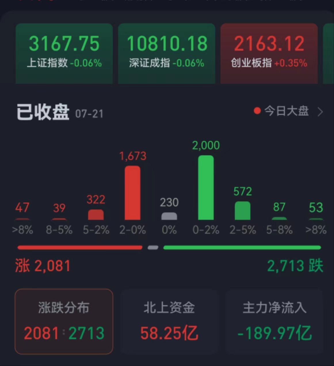 周五(7月21日),A股三大股指震蕩分化,漲跌不一。截至收盤,上證指數(shù)微跌0.06%報(bào)3167.75點(diǎn),深證成指跌0.06%報(bào)10810.18點(diǎn),創(chuàng)業(yè)板指漲0.35%報(bào)2163.12點(diǎn);兩市合計(jì)成交7109.57億元,北向資金凈買入58.25億元,其中,滬股通凈買入39.93億元,深股通凈買入18.32億元。本周北向資金累計(jì)凈賣出75.25億元??傮w上看,兩市個(gè)股跌多漲少。其中,漲停個(gè)股達(dá)35只,跌停個(gè)股達(dá)16只。