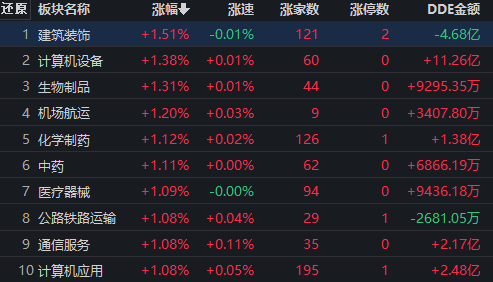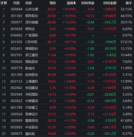 從早盤(pán)表現(xiàn)強(qiáng)勢(shì)的建筑裝飾行業(yè)看,交易中的154只成份股中,有121只上漲,其中,有10只個(gè)股漲幅超5%。