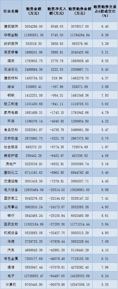 表:7月21日申萬(wàn)一級(jí)行業(yè)兩融交易情況