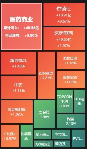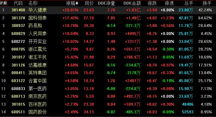 具體看,截至8月15日上午收盤(pán),醫(yī)藥商業(yè)板塊逆市崛起,漲幅居首達(dá)3.80%,資金凈流入48.56億元。其中,華人健康20CM漲停、國(guó)科恒泰、藥易購(gòu)、人民同泰、開(kāi)開(kāi)實(shí)業(yè)等概念股漲幅均超10%。