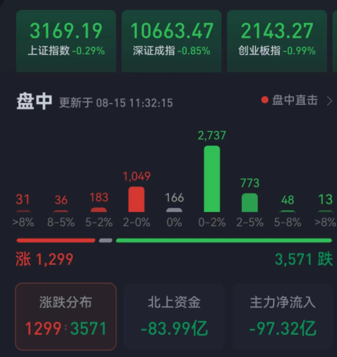 周二(8月15日),三大股指繼續(xù)震蕩整理。截至上午收盤(pán),上證指數(shù)跌幅達(dá)0.29%,報(bào)3169.19點(diǎn);深證成指和創(chuàng)業(yè)板指跌幅分別為0.85%和0.99%;滬深兩市合計(jì)成交額4276.9億元,總體來(lái)看,兩市個(gè)股跌多漲少,下跌個(gè)股近3600只。