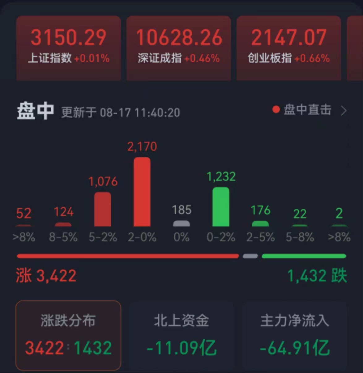 周四(8月17日),三大股指震蕩攀升,頑強翻紅。截至上午收盤,上證指數(shù)漲幅達0.01%,報3150.29點;深證成指和創(chuàng)業(yè)板指漲幅分別為0.46%和0.66%;滬深兩市合計成交額4711.4億元,總體來看,兩市個股漲多跌少,其中,超3400只個股上漲。