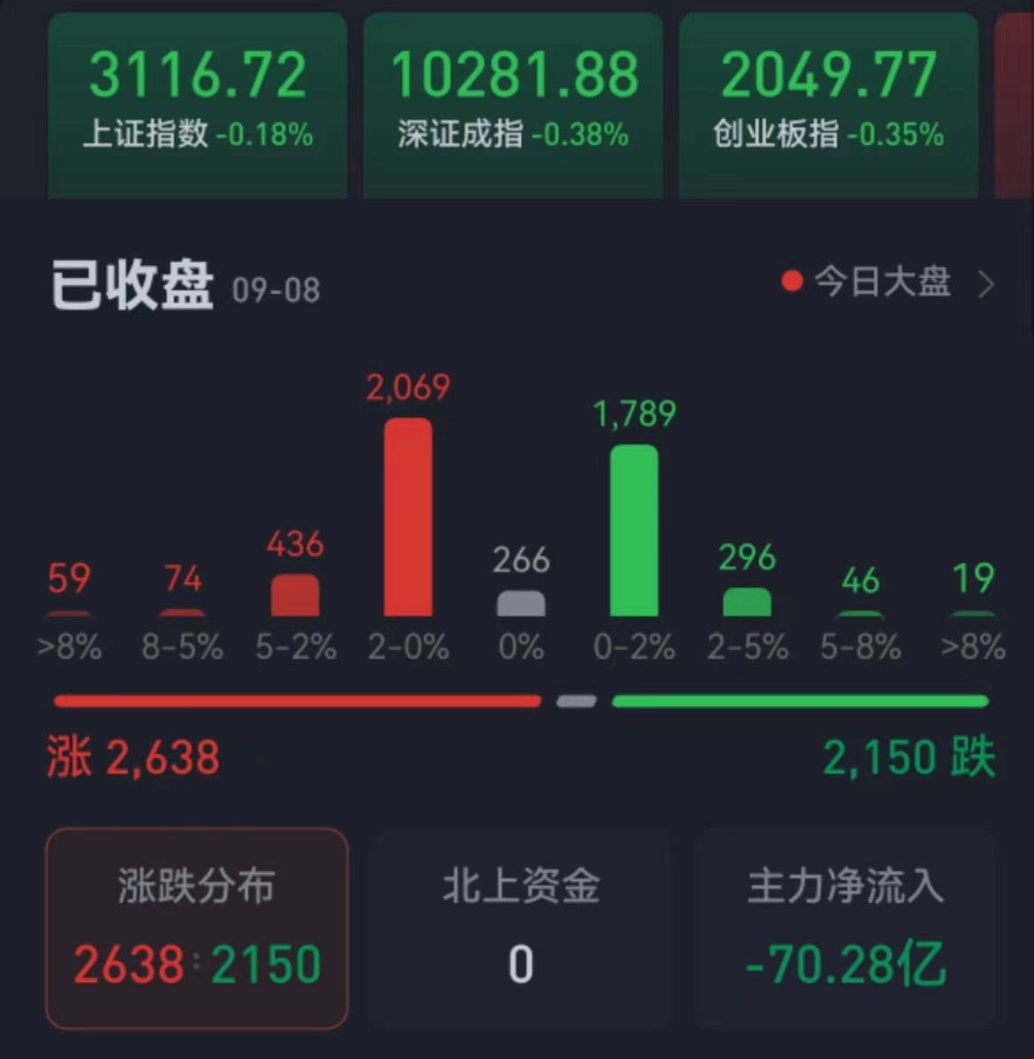 周五(9月8日),A股三大股指震蕩整理。截至收盤,上證指數(shù)跌0.18%報3116.72點(diǎn),深證成指跌0.38%報10281.88點(diǎn),創(chuàng)業(yè)板指跌0.35%報2049.76點(diǎn);兩市合計(jì)成交金額6818.1億元??傮w上看,兩市個股漲多跌少。其中,漲停個股達(dá)44只,跌停個股達(dá)5只。