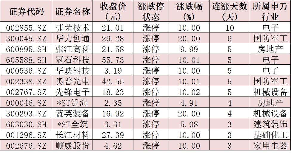 連續(xù)上漲3日且今日收盤漲停個股情況