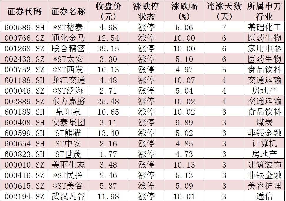 表:連續(xù)上漲3日且今日收盤漲停個(gè)股情況: