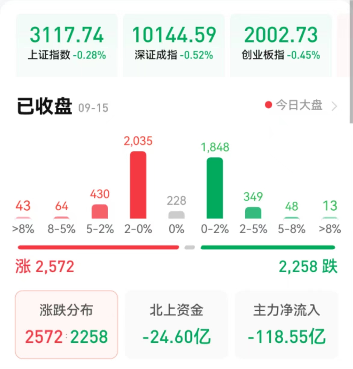 周五(9月15日),A股三大股指震蕩下行,截至收盤,上證指數(shù)跌0.28%報(bào)3117.74點(diǎn),深證成指跌0.52%報(bào)10144.59點(diǎn),創(chuàng)業(yè)板指漲跌0.45%報(bào)2002.73點(diǎn),兩市合計(jì)成交金額達(dá)7217.34億元,北向資金凈賣出24.60億元??傮w上看,兩市個(gè)股漲多跌少。其中,漲停個(gè)股達(dá)46只,跌停個(gè)股達(dá)1只。