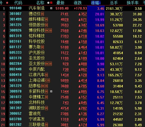 具體看,截至9月18日上午收盤,汽車制造板塊強勁上揚,漲幅居首達3.46%,多只概念股集體漲停,上演“漲停潮”。其中,德邁仕和維科精密“20cm”漲停,恒勃股份和博俊科技等概念股漲幅均超10%。銘科精技、科華控股、賽力斯、滬光股份、圣龍股份、亞太股份等概念股紛紛漲停。