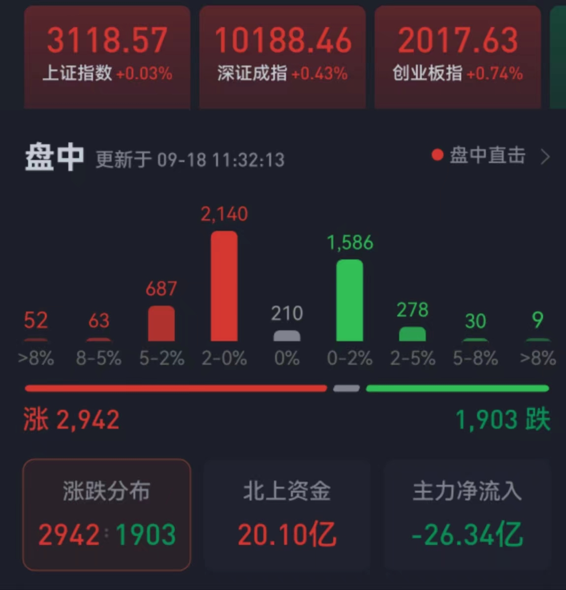 周一(9月18日),三大股指震蕩攀升,全線飄紅。截至上午收盤,上證指數(shù)漲幅達0.03%,報3118.57點;深證成指和創(chuàng)業(yè)板指漲幅分別為0.43%和0.74%;滬深兩市合計成交額4455.1億元,總體來看,兩市個股漲多跌少,上漲個股近3000只。漲停個股達46只,跌停個股達7只。