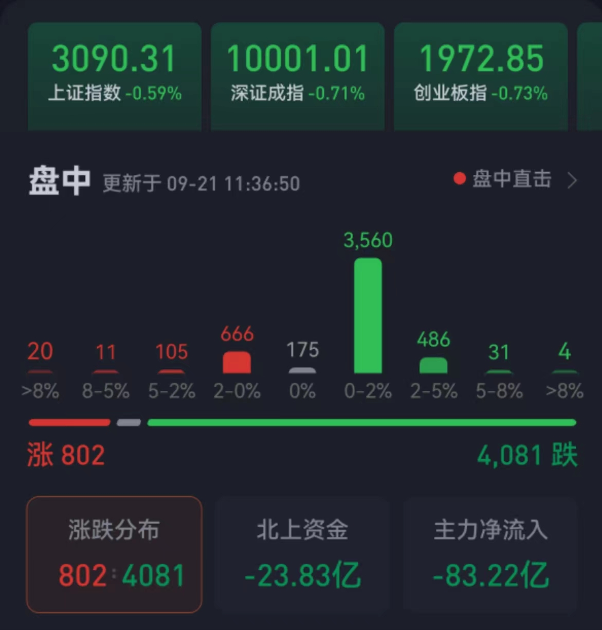 周四(9月21日),三大股指繼續(xù)震蕩整理。截至上午收盤,上證指數(shù)跌幅為0.59%,報3090.31點;深證成指和創(chuàng)業(yè)板指跌幅分別為0.71%和0.73%;滬深兩市合計成交額3496.9億元,總體來看,兩市個股跌多漲少,超4000只個股下跌。漲停個股17只,跌停個股1只。