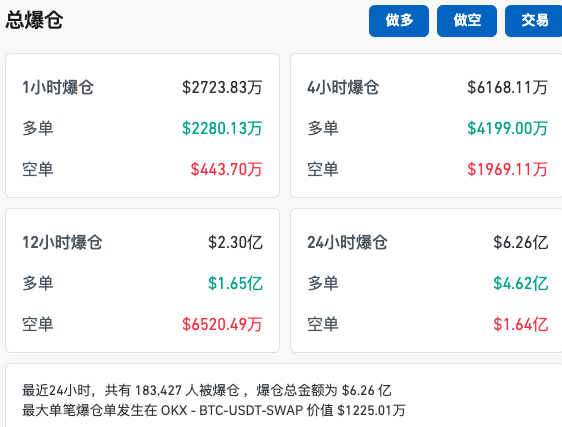 事實上,除比特幣外,其他加密幣價格也有較大幅度的下跌,其中以太坊24小時跌幅約達到6.67%、狗狗幣24小時跌幅約達到5.27%。在一眾加密幣價格下跌的同時,CoinGlass數(shù)據(jù)顯示,最近24小時內(nèi)共有超過約18萬人被爆倉,爆倉總金額高達6.26億美元。