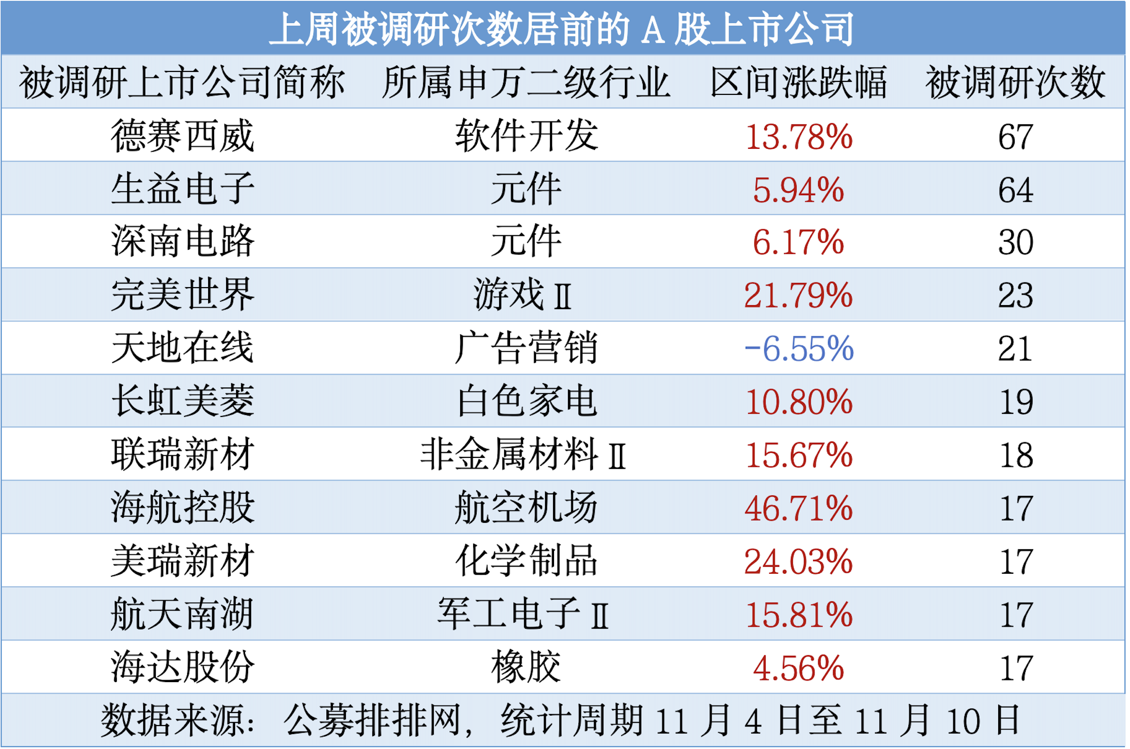 德賽西威當(dāng)周被調(diào)研67次居首,該公司主要業(yè)務(wù)涵蓋智能座艙、智能駕駛等領(lǐng)域,公司的核心主營業(yè)務(wù)是智能座艙。此外,生益電子、深南電路、完美世界、天地在線、長虹美菱、聯(lián)瑞新材、海達(dá)股份、海航控股、航天南湖、美瑞新材等被調(diào)研次數(shù)居前,均不少于17次。