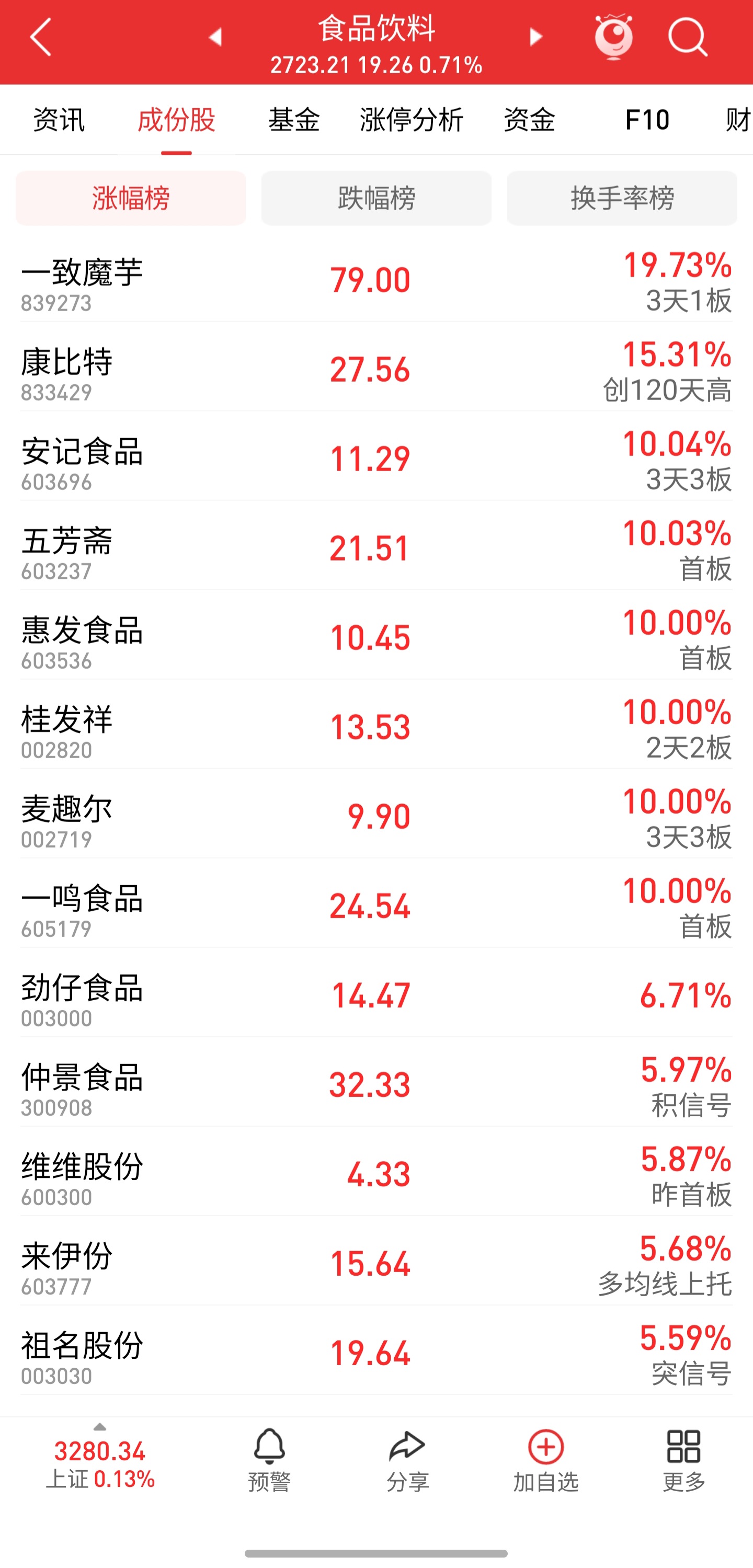 據(jù)通達(dá)信數(shù)據(jù),截至4月17日收盤,食品飲料板塊整體飄紅,安記食品(股票代碼:603696)、五芳齋(股票代碼:603237)、惠發(fā)食品(股票代碼:603536)等多只個(gè)股漲停,該板塊中,一致魔芋(股票代碼:839273)漲幅格外奪目,其股價(jià)收盤漲19.73%,報(bào)79元/股。
