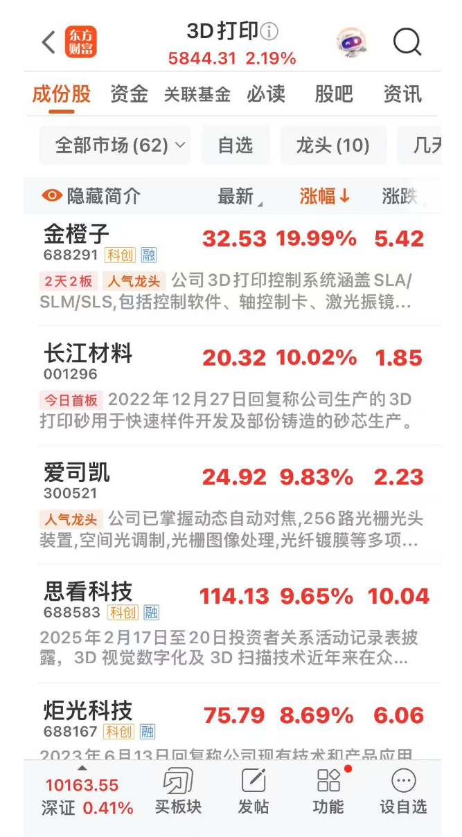 6月16日下午開盤后,3D打印概念板塊漲幅明顯擴大。東方財富軟件顯示,截至收盤,3D打印概念股中金橙子(688291)“20cm”漲停,長江材料(001296)“10cm”漲停,愛司凱(300521)、思看科技(688583)、炬光科技(688167)、金運激光(300220)等股漲超8%。