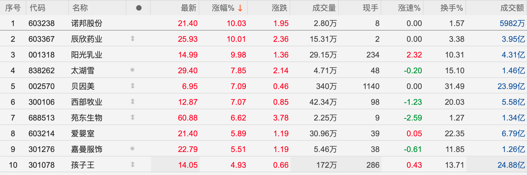 7月29日,受國家育兒補貼制度實施方案公布的利好刺激,A股乳業(yè)、嬰童、生殖等相關(guān)主題板塊開盤強勢拉升。截至記者發(fā)稿,乳業(yè)板塊陽光乳業(yè)(001318.SZ)漲停,騎士乳業(yè)(832786.BJ)漲11.28%,貝因美(002570.SZ)、西部牧業(yè)(300106.SZ)漲超5%;嬰童板塊諾邦股份(603238.SH)、辰欣藥業(yè)(603367.SH)漲停,太湖雪(838262.BJ)、苑東生物(688513.SH)、愛嬰室(603214.SH)、嘉曼服飾(301276.SZ)漲超5%;生殖板塊眾生藥業(yè)(002317.SZ)漲停。