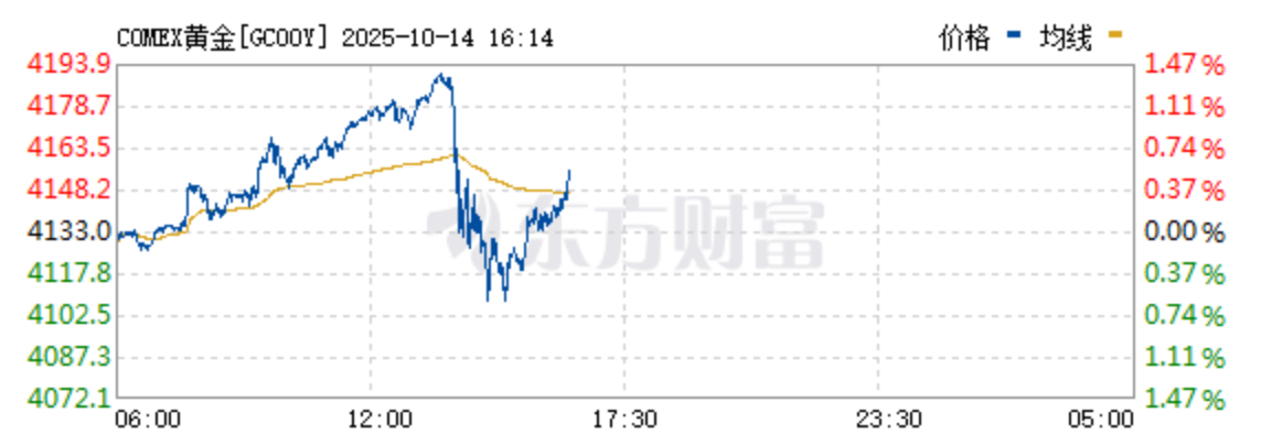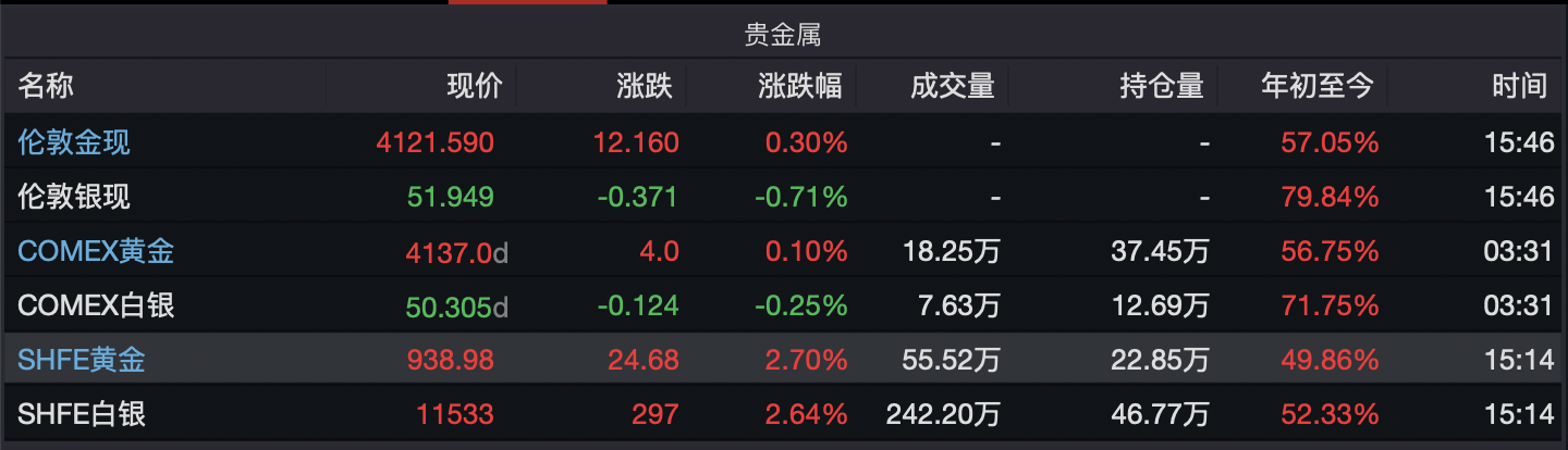 午后,黃金白銀盤(pán)中跳水;現(xiàn)貨黃金、COMEX黃金、現(xiàn)貨白銀、COMEX白銀紛紛翻綠,其中,現(xiàn)貨黃金報(bào)價(jià)4106.505美元/盎司較盤(pán)中最高點(diǎn)下跌超70美元;滬金、滬銀漲幅縮窄至2%左右。截至北京時(shí)間15點(diǎn)收盤(pán),滬金、滬銀分別收漲2.70%、2.64%。