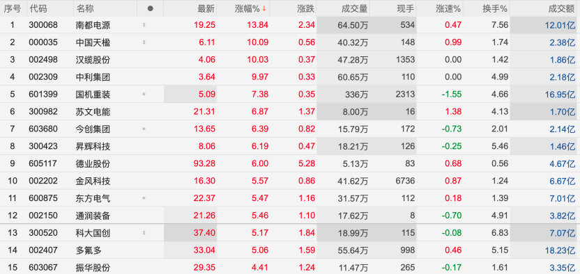 截至記者發(fā)稿,中國天楹(000035.SZ)、漢纜股份(002498.SZ)、中利集團(tuán)(002309.SZ)等多只儲(chǔ)能概念股強(qiáng)勢漲停,南都電源(300068.SZ)漲幅高達(dá)13.84%。此外,國機(jī)重裝(601399.SH)、蘇文電能(300982.SZ)、今創(chuàng)集團(tuán)(603680.SH)等個(gè)股也有不俗表現(xiàn),漲幅均超過6%。