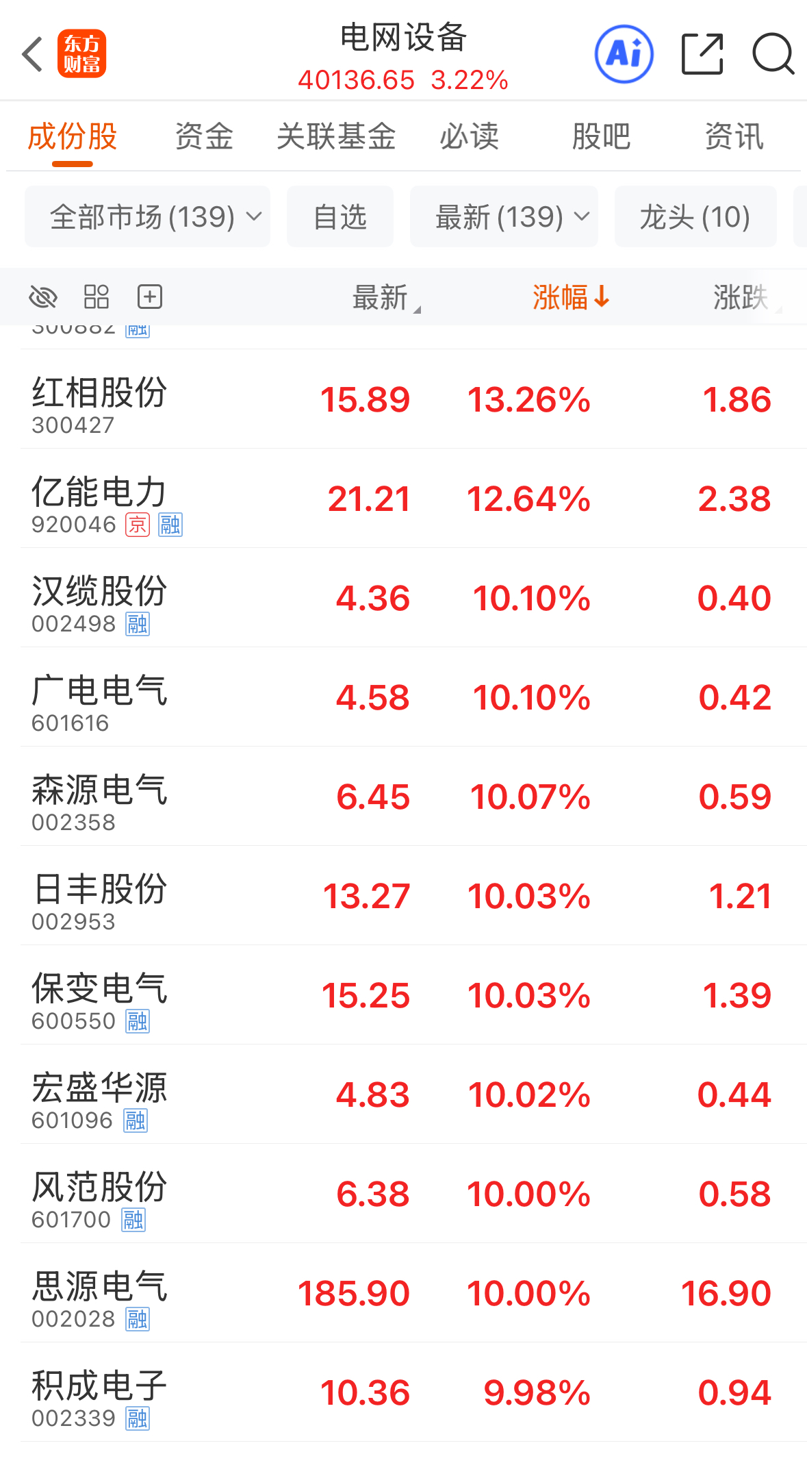 截至記者發(fā)稿時(shí),電科院20cm漲停,漢纜股份、廣電電氣、森源電氣、日豐股份等股票亦漲停,萬勝智能、億能電力、紅相股份、平高電氣、雙杰電氣、煜邦電力等多股大漲。