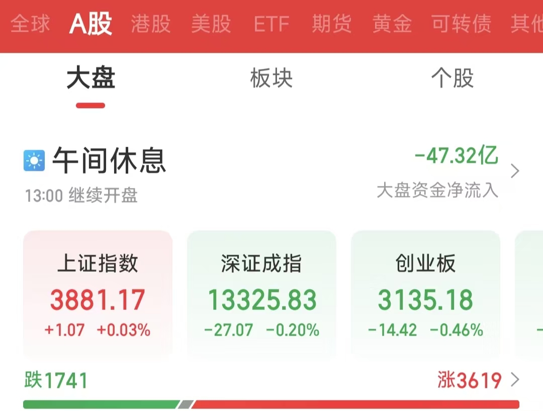 周二(4月7日),三大股指走勢分化,整體維持震蕩整理態(tài)勢。截至上午收盤,上證指數(shù)微漲0.03%,報3881.17點;深證成指下跌0.2%,報13325.83點;創(chuàng)業(yè)板指下跌0.46%,報3135.18點。滬深兩市合計成交額10720.91億元,市場交投保持活躍??傮w來看,兩市個股漲多跌少,3619只個股實現(xiàn)上漲。