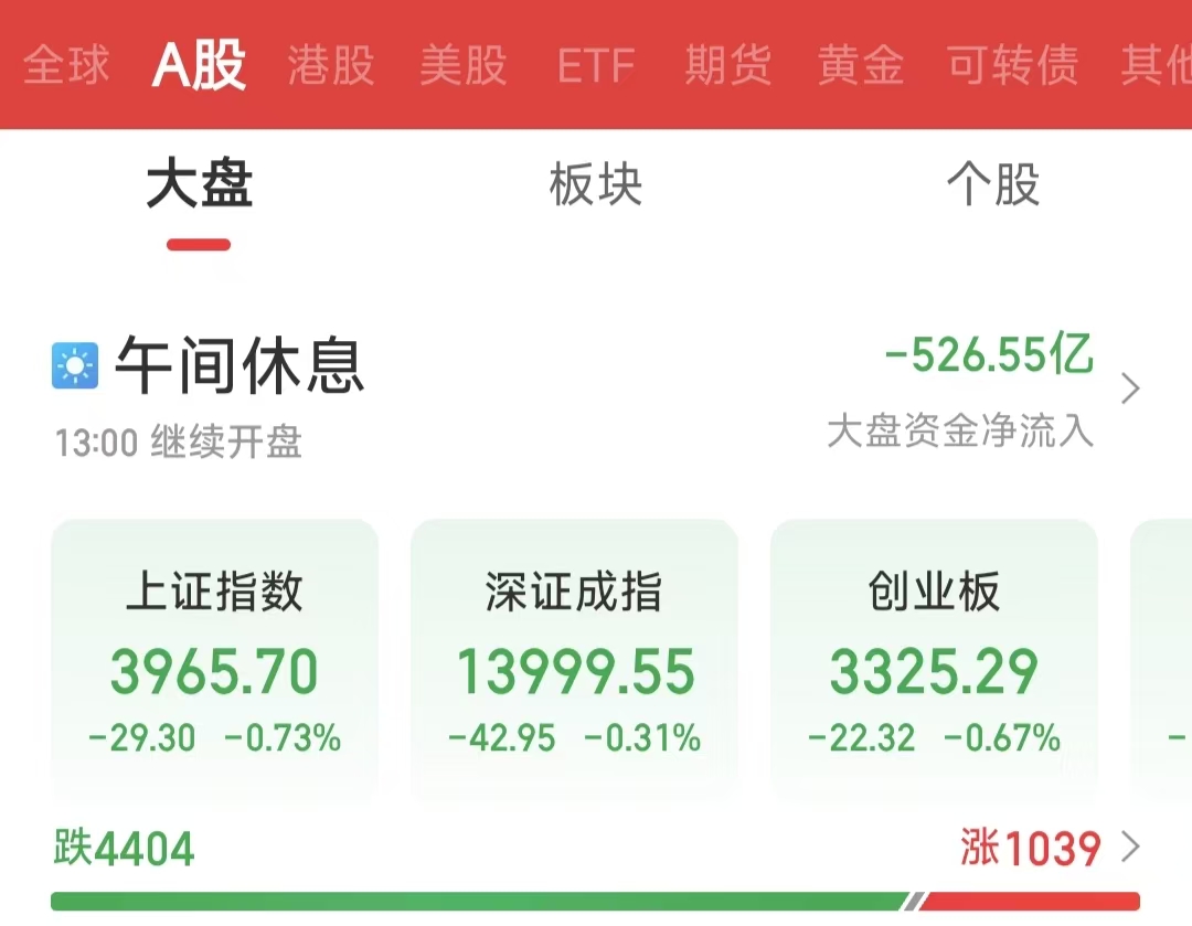 周四(4月9日),A股市場早盤呈現(xiàn)震蕩整理態(tài)勢,三大指數(shù)小幅收跌。截至上午收盤,上證指數(shù)下跌0.73%,報3965.70點;深證成指下跌0.31%,報13999.55點;創(chuàng)業(yè)板指下跌0.67%,報3325.29點。滬深兩市合計成交額14260.89億元,市場交投保持平穩(wěn)。總體來看,市場呈現(xiàn)調(diào)整態(tài)勢,個股跌多漲少。