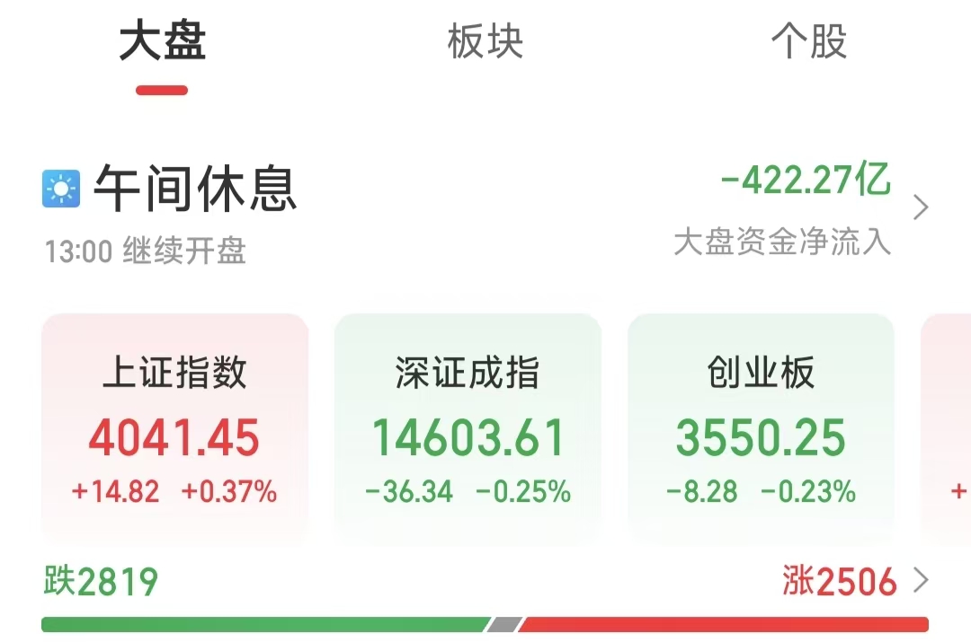 周三(4月15日),早盤呈現(xiàn)震蕩格局。截至上午收盤,上證指數(shù)上漲0.37%,報4041.45點;深證成指下跌0.25%,報14603.61點;創(chuàng)業(yè)板指下跌0.23%,報3550.25點。滬深兩市合計成交額15841.16億元,市場交投活躍??傮w來看,個股呈現(xiàn)分化態(tài)勢,跌多漲少。