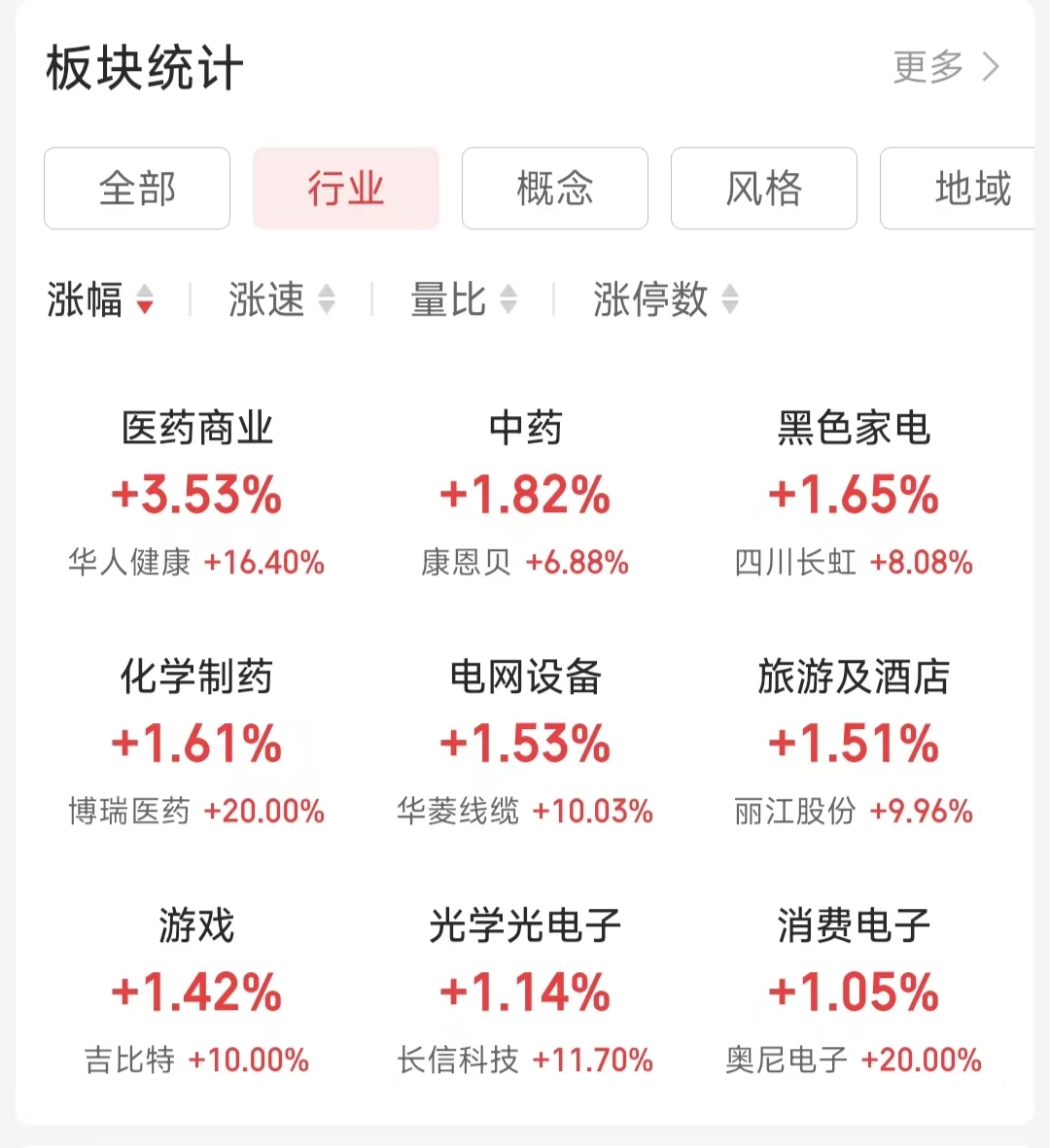 行業(yè)熱點方面,iFinD數(shù)據(jù)顯示,截至4月15日上午收盤,在同花順A股二級行業(yè)中,醫(yī)藥商業(yè)行業(yè)漲幅達(dá)到3.53%,位居榜首。中藥(漲幅1.82%)、黑色家電(漲幅1.65%)、化學(xué)制藥(漲幅1.61%)等行業(yè)緊隨其后。此外,電網(wǎng)設(shè)備、旅游及酒店、游戲等行業(yè)也錄得小幅上漲。