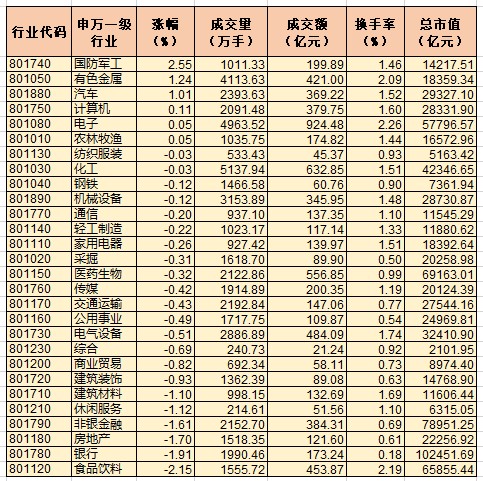 從申萬一級28個行業(yè)指數(shù)來看,《證券日報》記者根據(jù)Choice統(tǒng)計數(shù)據(jù)發(fā)現(xiàn),截至11月13日收盤,有6個行業(yè)指數(shù)收漲,具體為國防軍工、有色金屬、汽車、計算機、電子、農(nóng)林牧漁行業(yè),其中國防軍工行業(yè)指數(shù)漲2.55%,漲幅居首位,而非銀金融、房地產(chǎn)、銀行、食品飲料行業(yè)指數(shù)跌幅均超1.6%。