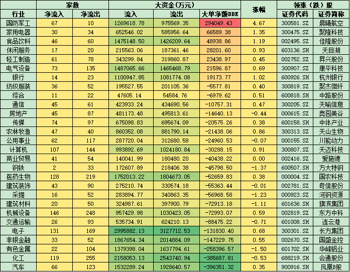 從資金層面看,今日A股大單資金整體凈流出143.75億元,占成交額1.86%,有1516只個(gè)股凈流入,2504只個(gè)股凈流出。有7類申萬一級(jí)行業(yè)呈現(xiàn)大單資金凈流入,國(guó)防軍工、家用電器、食品飲料等位居前三。