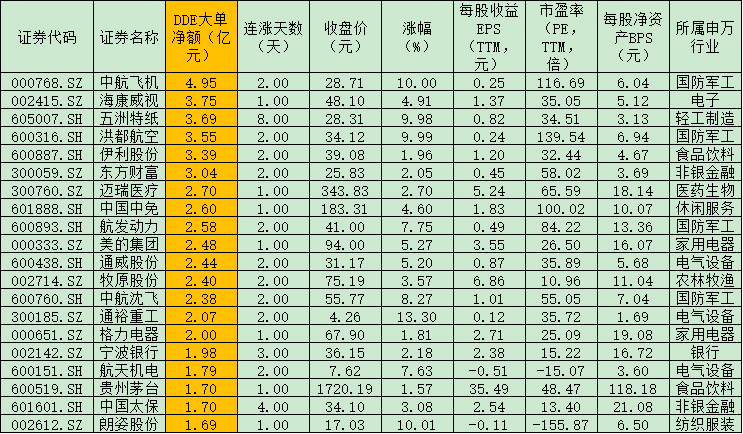 一、今日DDE大單資金凈買入TOP20