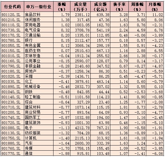 表:12月16日申萬一級行業(yè)指數(shù)表現(xiàn)一覽