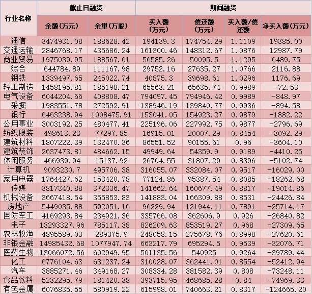 六、截至12月29日申萬一級(jí)行業(yè)兩融交易情況