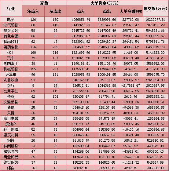 二、周三(12月30日)申萬一級(jí)行業(yè)大單資金流向
