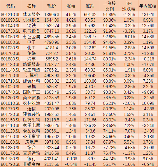 申萬一級行業(yè)指數(shù)方面,有26類行業(yè)指數(shù)上漲,休閑服務(4.52%)、機械設備(4.02%)、鋼鐵(3.95%)等居前三位,僅非銀金融(-0.54%)、銀行(-0.10%)兩類行業(yè)小幅回落。個股方面,A股呈普漲格局,漲跌比達7.44。