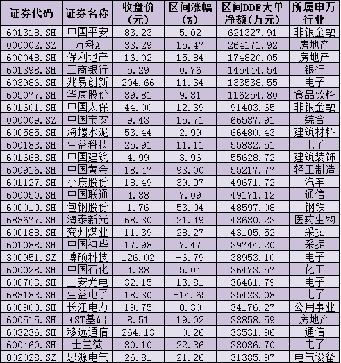 從具體的個(gè)股情況來看,節(jié)后以來的9個(gè)交易日中,有1206只個(gè)股呈現(xiàn)資金凈流入態(tài)勢,占可交易個(gè)股總數(shù)的28.8%。其中,有88只個(gè)股期間大單資金凈流入超1億元,中國平安、萬科A、保利地產(chǎn)、工商銀行、兆易創(chuàng)新、華康股份等6只個(gè)股,期間累計(jì)資金凈流入均超10億元,分別為62.13億元、26.42億元、17.48億元、14.54億元、13.35億元、11.63億元,合計(jì)資金凈流入達(dá)145.55億元