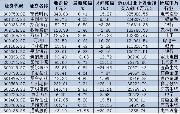 從滬股通、深股通前十大成交活躍股來看,節(jié)后以來的10個交易日中,共有37只個股現(xiàn)身前十大成交活躍股榜單,19只活躍股處于期間凈買入狀態(tài),北上資金合計凈買入182.79億元。其中,寧德時代(32.5億元)、中國平安(22.48億元)、招商銀行(21.48億元)、牧原股份(15.28億元)、萬華化學(xué)(12.38億元)、萬科A(12.19億元)、興業(yè)銀行(11.13億元)、平安銀行(10.02億元)等個股期間北上資金合計凈買入額居前,均在10億元以上,多數(shù)為藍籌股。