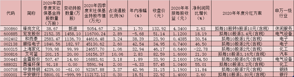 表:已披露2020年年度分紅方案且去年四季度獲社?;鸪謧}的個股